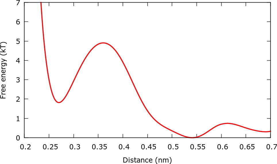 For the first VES simulation we will revisit the problem of the ion pair dissociation but replacing the metadynamics bias with a VES bias. The bias potential will be constructed on the distance Na-Cl as done before. We will still use the upper wall used in the metadynamics tutorial to make the actual example as similar as possible to the previous one. We will then see that VES has a more natural way to deal with barriers. All files needed for this example can be found in the Example1 folder.