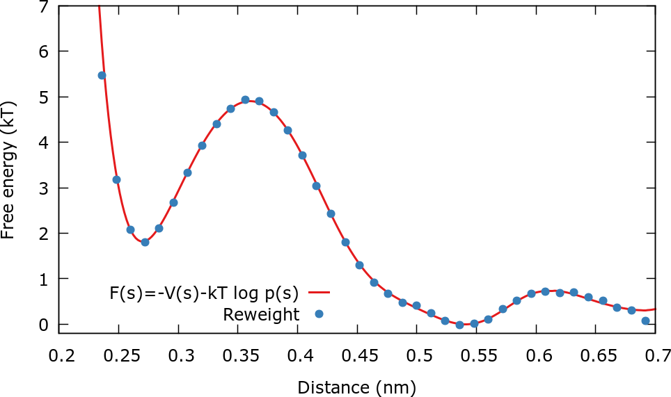 The files needed for this reweighting are contained in the folder ReweightDistance. The procedure to the the reweighting and plot the results is similar to the ones in the cases above and therefore it is not described in detail. The reweighted FES is plotted in the next figure and compared to the FES calculated from the formula \( V(\mathbf{s}) = -F(\mathbf{s})-{\frac {1}{\beta}} \log {p(\mathbf{s})} \).