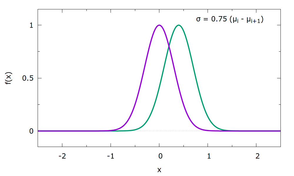 As an example two adjacent basis functions (with the mentioned width choice of 75% of the sub-interval length) can be seen below. The full basis consists of shifted Gaussians in the full specified interval.