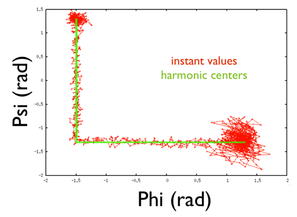 By plotting the instataneous value of the variables and the value of the center of the harmonic potentials we can inspect the pathways that we make the system walk on the Ramachandran plot. (How to do this? Have a look to the header of COLVAR file to plot the right fields)