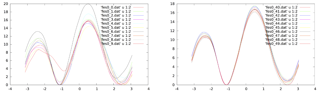 In the resources for this tutorial you can find the results for a 40ns long Well-Tempered Bias Exchange simulation. First of all we can try to assess the convergence of the simulations by looking at the profiles. In the "convergence" folder there is a script that calculates the free energy from the HILLS.0 file at incresing simulation lengths (i.e. every more 0.8 ns of simulation). The scripts also generate two measures of the evolution of the profiles in time: