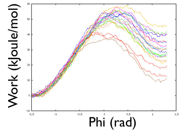 Now we run, say 30 SMD run and we calculate the free energy difference by using Jarzynski equality and see how this differs from the average. First note that the average \( \langle \exp^{-\beta W} \rangle \) is an average over a number of steered MD runs which start from the same value of CV and reach the final value of CV. So it is important to create initially an ensemble of states which are compatible with a given value of CVs. Let's assume that we can do this by using a restrained MD in a point (say at \( Phi=-1.5 \)). In practice the umbrella biases a bit your distribution and the best situation would be to do this with a flat bottom potential and then choosing the snapshot that correspond to the wanted starting value and start from them.