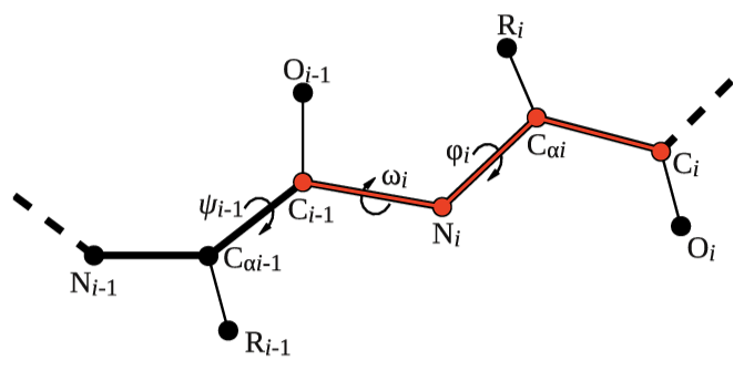 Let's try to use this functionality to calculate the backbone dihedral angle \( \phi \) (phi) of residue 2 of the 5-HT1B receptor. This CV is defined by the action TORSION and a set of 4 atoms. For residue i, the dihedral \( \phi \) is defined by these atoms: C(i-1),N(i),CA(i),C(i) (see Fig. masterclass-21-1-dih-fig).