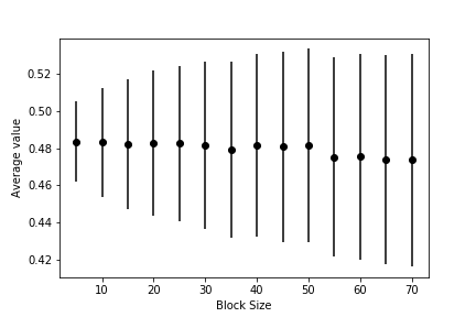 Notice that you can also calculate the error bar using bootstrapping by selecting samples from your block averages. If you have time, you should try this. You should try to confirm that this method gives similar estimates for the error.