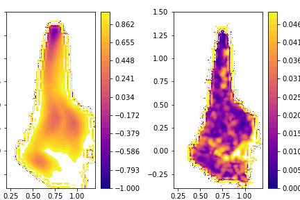 For the rest of the exercise, you are on your own. You must use what you have learned in the other parts of the tutorial to generate plots similar to those shown below. The leftmost plot here is the free energy surface computed by taking the (weighted) average of the blocks, the right panel shows the size of the error bar on the free energy at each point of the free energy surface.