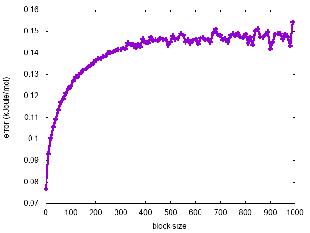 As expected, the error increases with the block length until it reaches a plateau in correspondence of a dimension of the block that exceeds the correlation between data points (Fig. trieste-4-block-phi).