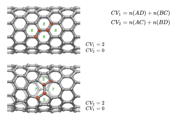 As an example of an activated process in materials science, we will work with the Stone-Wales transformation in a carbon nanotube. The tarball for this project contains the inputs necessary to run a simulation in LAMMPS for a 480 atom carbon nanotube. We use the AIREBO (Adaptive Intermolecular Reactive Empirical Bond Order) force field parameters which can approximately describe C-C bond breakage and formation at reasonable computational cost. For CVs we can use the coordination number in PLUMED to measure the number of covalent bonds among different groups of atoms. The transformation involves breaking two C-C bonds and forming two alternative C-C bonds.A definition of these CVs as well as the relevant C-C bonds are depicted in Figure stone-wales. We prepare a PLUMED input file as follows.