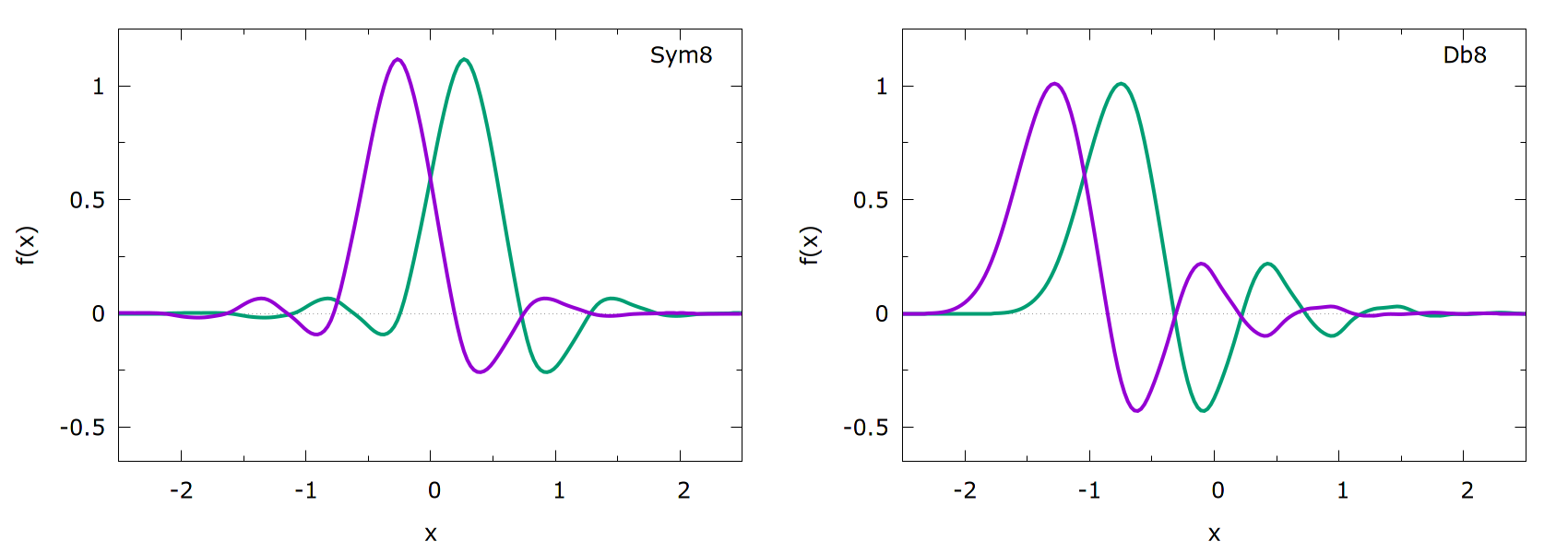 As an example two adjacent basis functions of both Sym8 (ORDER=8, TYPE=SYMLET) and Db8 (ORDER=8, TYPE=DAUBECHIES) is shown in the figure. The full basis consists of shifted wavelets in the full specified interval.