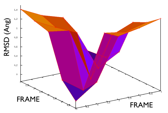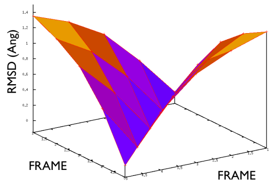 A truly important point is that if you get a trajectory from some form of accelerated dynamics (e.g. simply by heating) this cannot simply be converted into a path. Since it is likely that your trajectory is going back and forth randomly (not in the case of SMD or US, discussed later), your trajectory might be not topologically suitable. To understand that, suppose you simply collect a reactive trajectory of 100 ps into the reference path you give to the PATHMSD and simply you assign the frame of 1 ps to index 1 (first frame occurring in the reference file provided to PATHMSD), the frame of 2 ps to index 2 and so on : it might be that you have two points which are really similar but one is associated to step, say 5 and the other is associated with frame 12. When you analyze the same trajectory, when you are sitting on any of those points then the calculation of S will be an average like \( S(X)=(5+12)/2=8.5 \) which is an average of the two indexes and is completely misleading since it let you think that you are moving between point 8 and 9, which is not the case. So this evidences that your reference frames should be "topologically consecutive". This means that frame 1 should be the closest to frame 2 and all the other frames should be farther apart. Similarly frame 2 should be equally close (in an RMSD sense) to 1 and 3 while all the others should be farther apart. Same for frame 3: this should be closest to frame 2 and 4 and farther apart from all the others and so on. This is equivalent to calculate an "RMSD matrix" which can be conveniently done in vmd (this is a good exercise for a number of reasons) with RMSD Trajectory tools, by choosing different reference system along the set of reference frames.