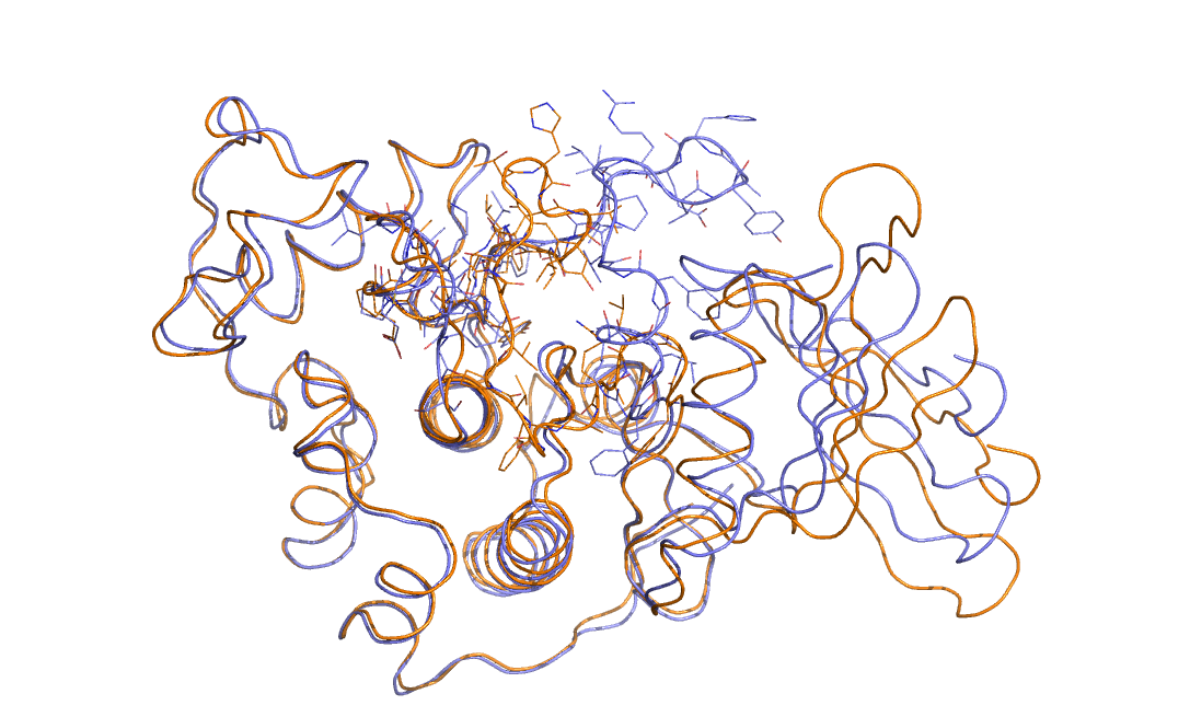 As an example in Figure belfast-2-cdk-fig I consider a large conformational transition like those involved in activating the kinase via open-close transition of the activation loop. In sticks you see the part involved in the large conformational change, the rest is either keeping the structure and just moving a bit or is a badly resolved region in the X-ray structure. This is a complex transition and it is hard to tell which is the order parameter that best describes the transition.