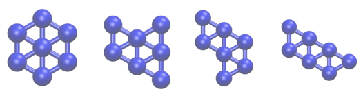 In this tutorial we are going to study a very simple physical system; namely, seven Lennard Jones atoms in a two dimensional space. This simple system has been extensively studied as has often been used to benchmark new simulation techniques. In addition, the potential energy landscape has been fully characterized and it is known that only the four structurally-distinct minima shown below exist: