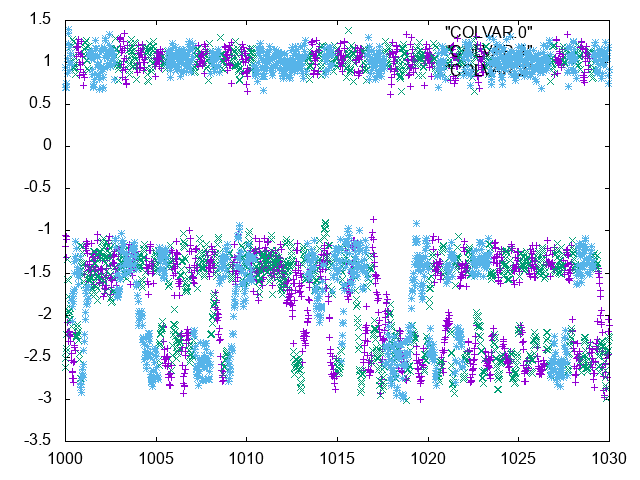 Also plot the colvar files and look at them with attention. An excerpt is shown below.
