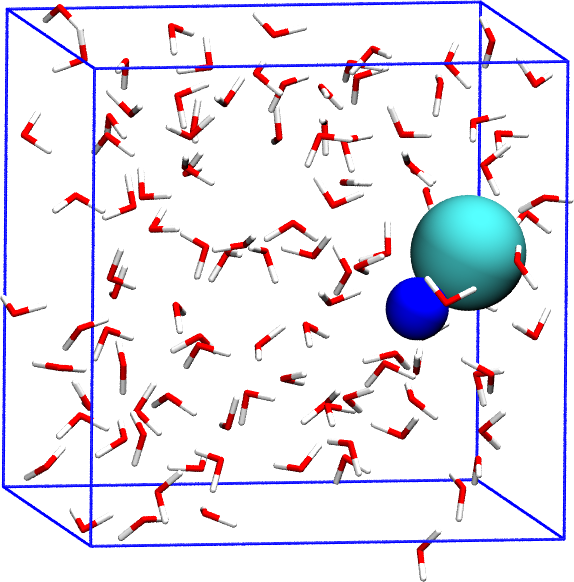 We consider the association/dissociation of NaCl in aqueous solution. The dissociation barrier is expected to be around 2.5 \(k_\mathrm{B} T\). One interesting aspect of the ion dissociation problem is that collective solvent motions play an important role in the transition. This problem has been considered in the original metadynamics paper [75] and also in reference [17] . We will use the potential developed in ref. [99] for NaCl and TIP3P water with parameters corrected to be used with long-range Coulomb solvers [107]. The system contains 1 Na, 1 Cl, and 106 water molecules (total 320 atoms).
