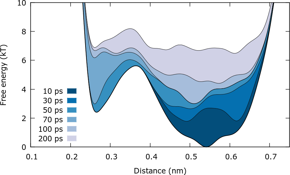It is important to stress that it is only possible to calculate the free energy difference between two points if the system has gone back and forth between these points several times. This applies both for the calculation of a barrier and the difference in free energy between two basins. It is also important to understand that none of the free energy methods described in this series of tutorials will be able to calculate free energies of regions that have not been sampled, i.e. visited.
