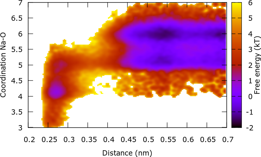 We can obtain important information of the system by reweighting on 2 CVs: The distance Na-Cl and the coordination of Na with O. This reweighting is similar to the one already done and the files that you will need are located in the ReweightBoth folder. Additionally the COLVAR file with the omitted first steps is required. The plot of the FES as a function of these 2 CVs provides important information of the association/dissociation mechanism. In the dissociated state, Na can have a coordination of 5 or 6, though it is more likely to find a coordination number of 6. However, in order to associate Na must have a coordination with O of 5. In the associated state Na can have a coordination of 3, 4 or 5. The transition state is characterized by a coordination number of ~5.