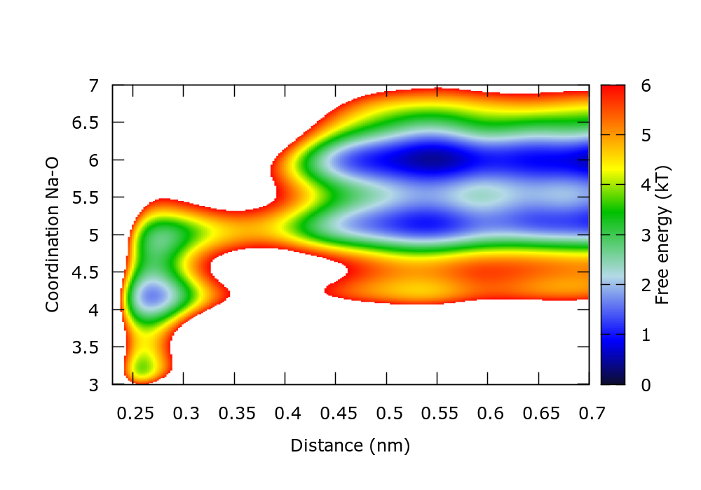 We have chosen the interval [0.23,0.8] nm for the distance and [2.5,7.5] for the coordination number. The total number of non-zero coefficients will be 400. In the coefficients file the indices \(i_{1}\) and \(i_{2}\) are given by the first two columns. We use the well-tempered target distribution together with a barrier at 0.6 nm on the distance Na-Cl.