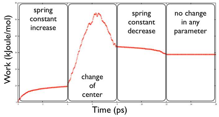 where we denoted \( \Delta \lambda(t_i) \) the difference of the center of the harmonic potential respect to the step before and \( \Delta k(t_i) \) is the difference in spring constant respect to the step before. So in the exercised proposed in the first phase you see only the second part of the work since this is the part connected with the spring constant increase. After this phase you see the increase due to the motion of the center and then you later the release of the spring constant.