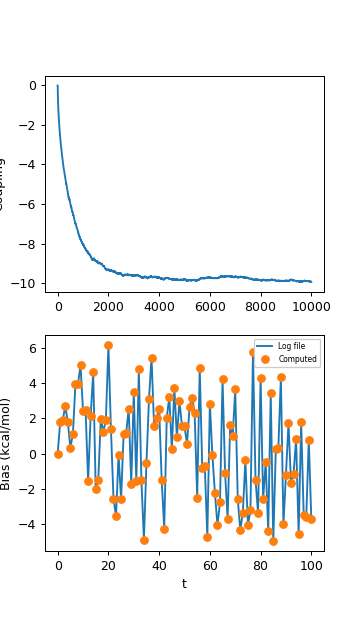 Now look at how the bias factor changes with time. Can you also compute the bias from this value, and the value of the position versus time? Look in the colvar file and the restart file to see what values are there.