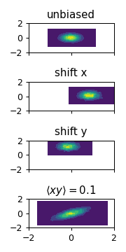 Try to bias either the x or y directions separately. Try biasing a combination of them. We biased the average of x*y to be = 1. Use the CUSTOM command to try that out. What do you think it should look like? Write a python program to histogram the x and y data and see. It should look like below.