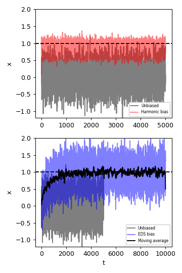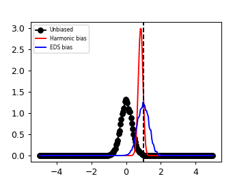 where \(U(x)\) is the potential energy of the system, \(f(x)\) is the CV, and \(\lambda\) is a fit parameter. EDS is a time-dependent method that finds \(\lambda\) while the simulation is running. It typically converges much faster than free-energy methods, but comes with the same caveats that insufficient sampling or rare events can affect the method. Another important detail is that EDS/maximum entropy biasing is for matching the set point on average (in expectation), rather than at every frame.