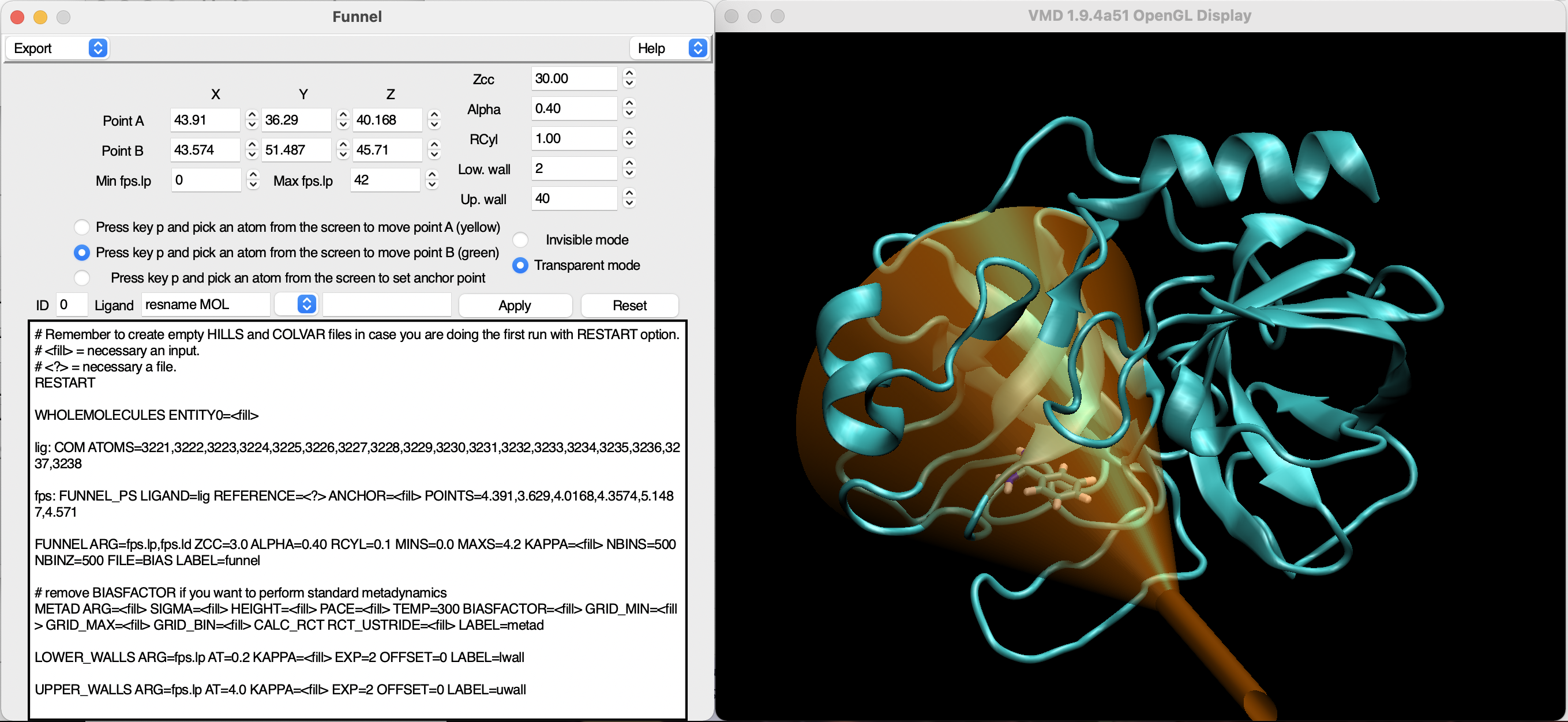 The newly created file contains all the compulsory lines to run a FM simulation. Few commands like WHOLEMOLECULES and RESTART can also be commented and will be discussed in the next exercise. Others must be completed by the user either with the interface, a text editor, or by hand in the VMD canvas. Here, we will briefly describe the missing parameters for the funnel, leaving to the user the job to complete the rest (i.e., METAD, LOWER_WALLS, and UPPER_WALLS).