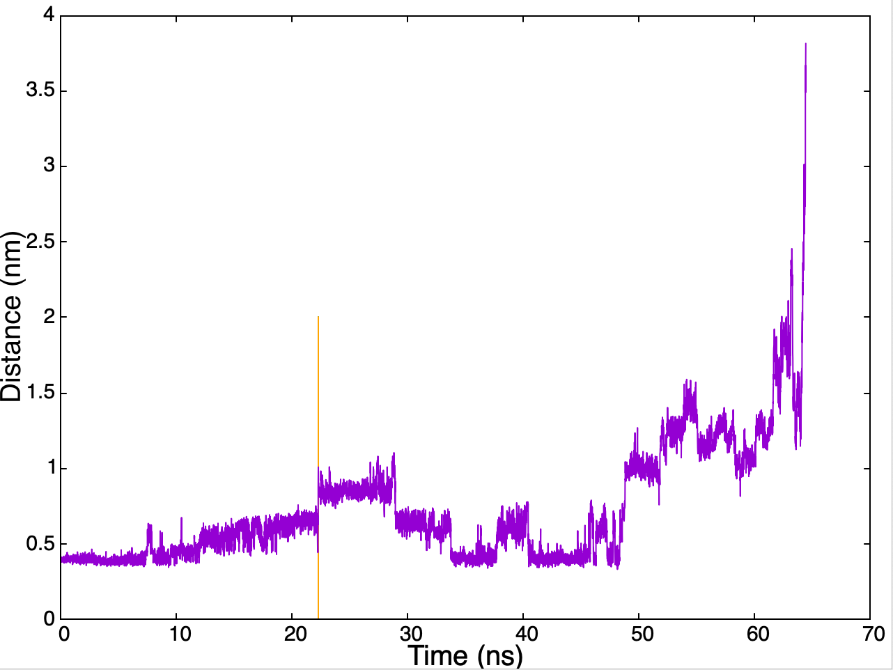Although the simulation lasted around 65 ns, our point of interest lies at around 22 ns (orange line), when we have a clear change in the sampling of the distance. Here, the absolute minimum was left thanks to the metadynamics bias added. We can measure the added bias up to that point by looking at the HILLS file. This information is important because, albeit low, the infrequent Metadynamics provides an acceleration booster to the simulation that must be estimated in order to extract the unbiased time for the transition.