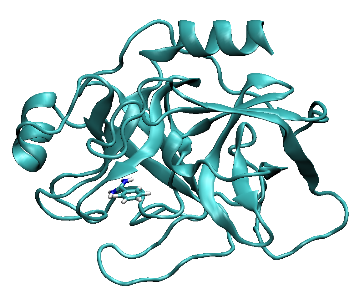 By visualizing the protein as new cartoon and the ligand (resname MOL) as licorice, it is possible to clearly see the binding pocket. Try to provide an acceptable orientation for the funnel, with the conical section faced towards the protein and the cylindrical one describing a possible unbindng route for benzamidine (see Fig. masterclass-22-1-funnel).