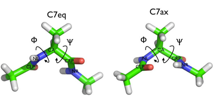 In this exercise, we will run a plain molecular dynamics simulation and monitor the \(\Phi\) and \(\Psi\) dihedral angles on the fly. Using the following PLUMED input file you can monitor \(\Phi\) and \(\Psi\) angles during the MD simulation