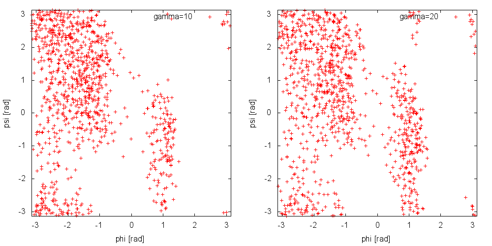 Have a look at the plot of (phi,psi) for the different simulations to understand what is happening.