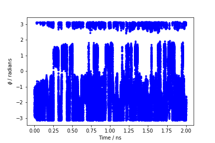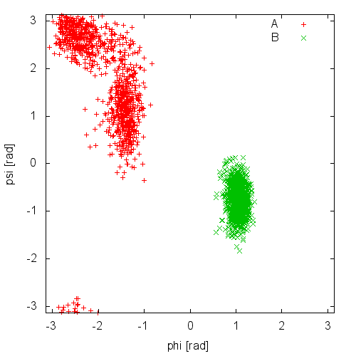 Now, run a metadynamics simulations and check the explored collective variable space. Results from a 200ps (100000 steps) trajectory in vacuum are shown in Figure munster-ala-traj-metad.