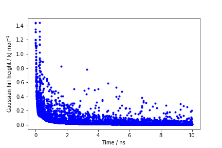 If we look carefully at the scale of the y-axis, we will notice that in the beginning the value of the Gaussian height is higher than the initial height specified in the input file, which should be 1.2 kJ/mol. In fact, this column reports the height of the Gaussian scaled by the pre-factor that in well-tempered metadynamics relates the bias potential to the free energy. In this way, when we will use sum_hills, the sum of the Gaussian kernels deposited will directly provide the free-energy, without further rescaling needed (see below).